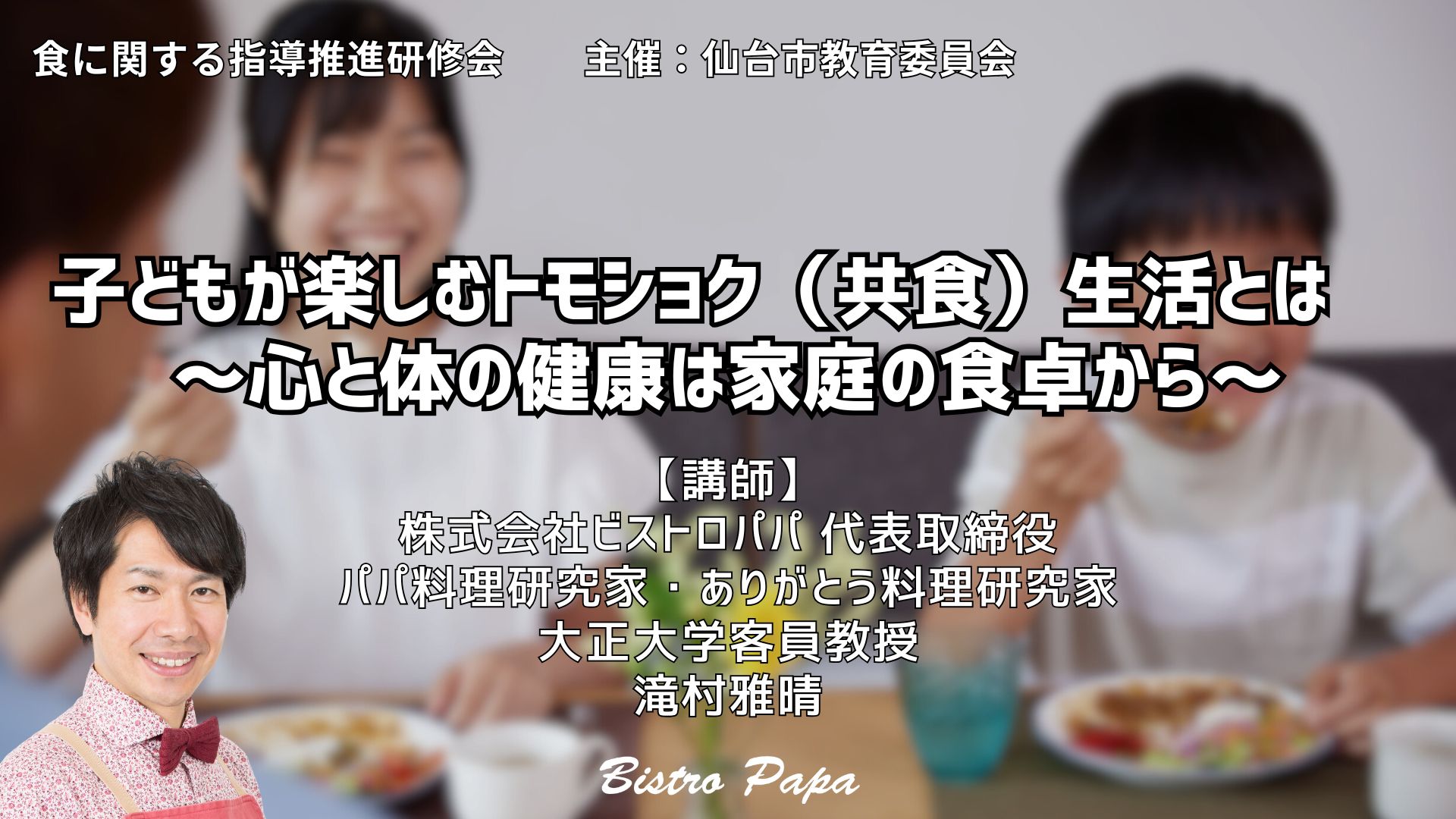 研修の講演タイトルは「子どもが楽しむトモショク(共食)生活とは ~心と体の健康は家庭の食卓から~